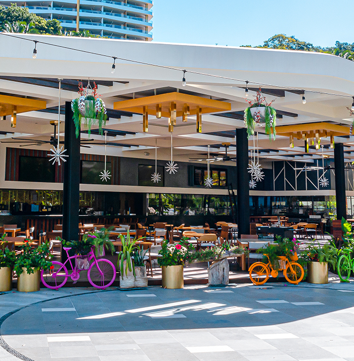 And with a pergola style roof that lets in lots of natural light. Guests can enjoy watching their entrees being grilled in real time in the show kitchen, or gather around the bar where expert mixologists craft unique and tasty cocktails. Panoramic views of the ocean where the colors of the sunset light up the evening complete the ambiance.